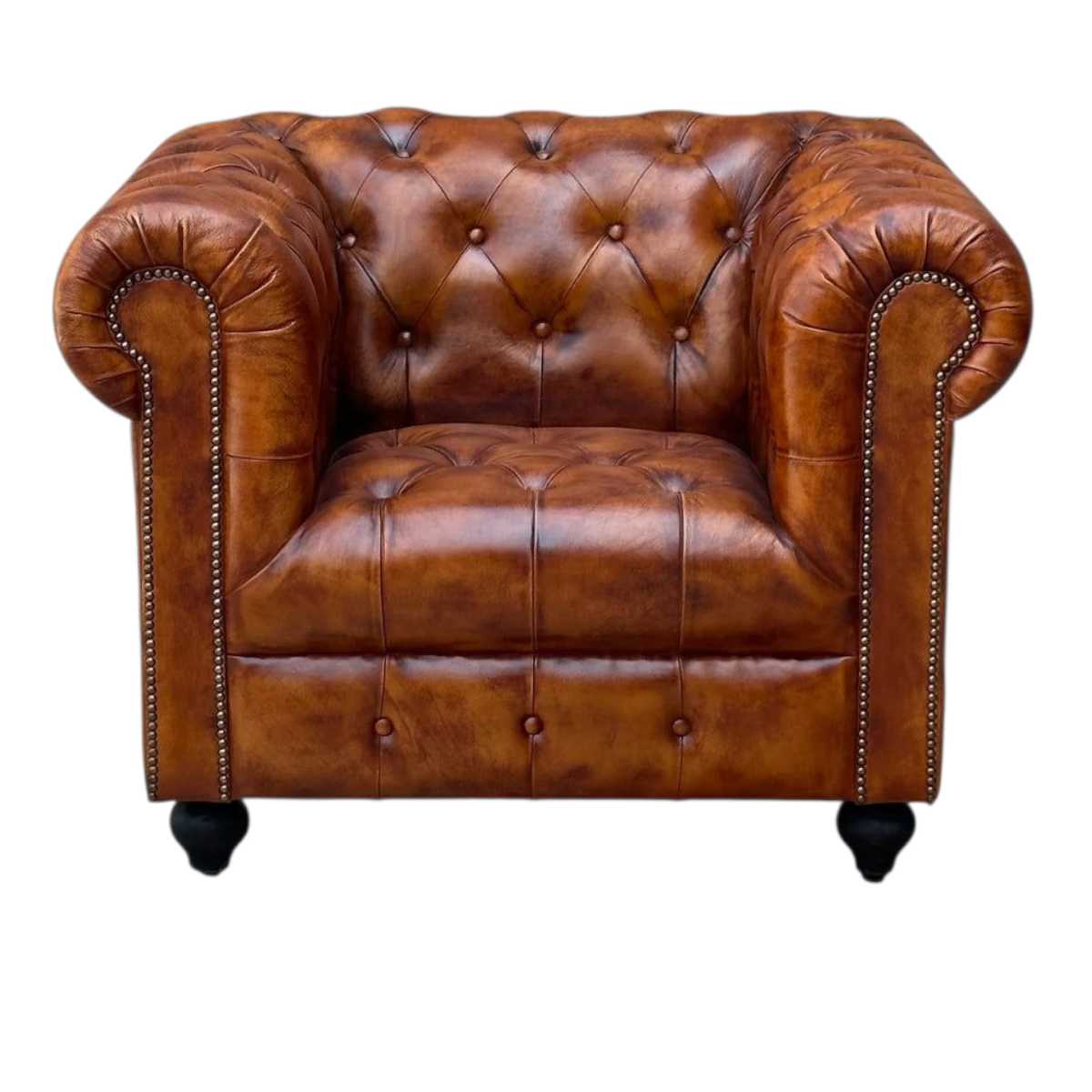 Introducing the timeless Chesterfield Leather Armchair, handcrafted with quality tufted upholstery made from genuine buffalo leather. This iconic piece is a must-have in any home, with its exquisite design and expertly dyed leather adding a touch of luxury to any space. Experience the expert craftsmanship and elegance of a true chesterfield armchair.