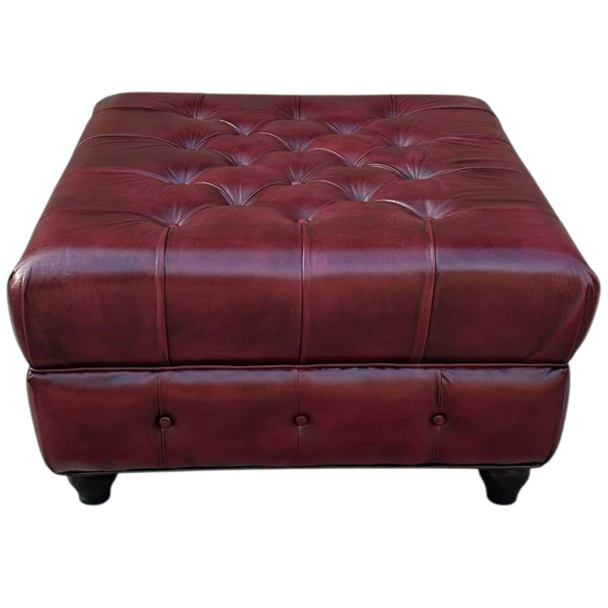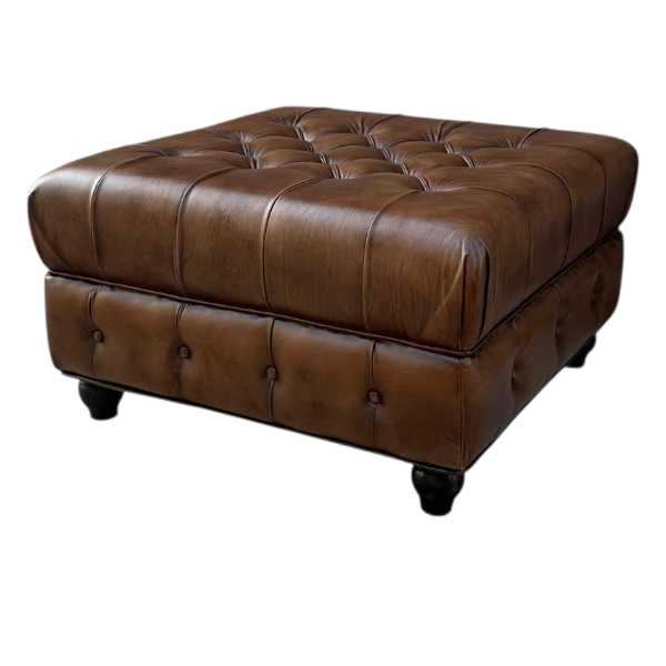 Experience the luxurious comfort and timeless style of the Lincoln Chesterfield Ottoman. Meticulously handcrafted with genuine buffalo leather, this executive class ottoman boasts an antique-like appearance achieved through traditional tools and techniques. Featuring a deep buttoned upholstery , this ottoman is the epitome of quality with its use of leather, solid wood, brass, and high density foam. Elevate your living space with this expertly made piece.