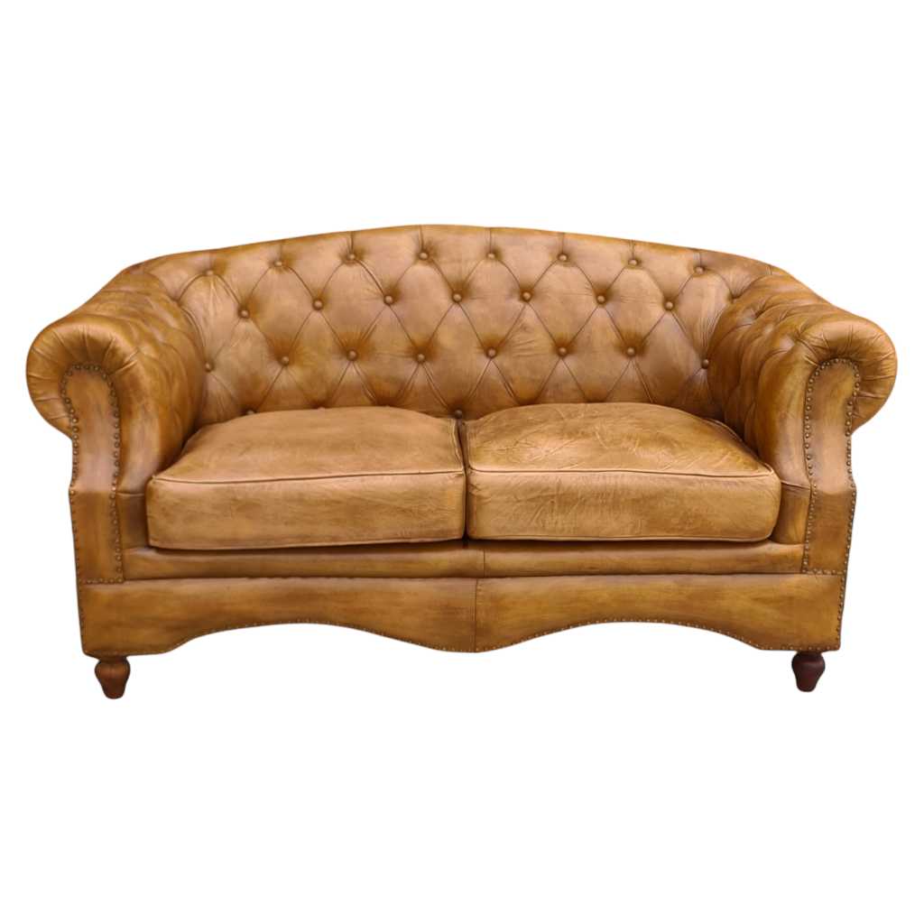 Introducing the Wexford Leather Chesterfield Sofa - a hand-crafted masterpiece of elegance and comfort. Made with genuine buffalo leather, solid wood frame, brass studs, and high-density foam, this classic and timeless sofa features rolled arms, turned wood feet, and a deep buttoned back for maximum comfort. Experience the finest craftsmanship with the curved and cushioned design of the Wexford sofa.