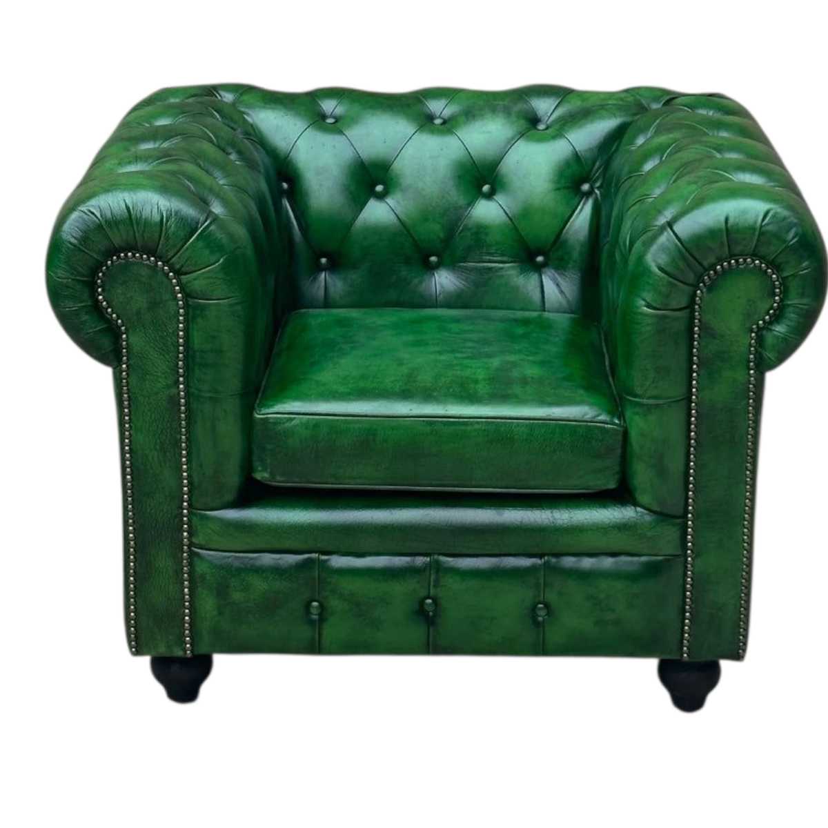 Introducing the Worcester Chesterfield Armchair ☆ Green, a timeless classic that exudes executive class. Handmade with quality materials including luxurious Buffalo Leather and a sturdy wood frame, this armchair boasts a deep buttoned back and arms, high-density foam, and elegant brass studs. Elevate your space with this high-class, cushioned seat.