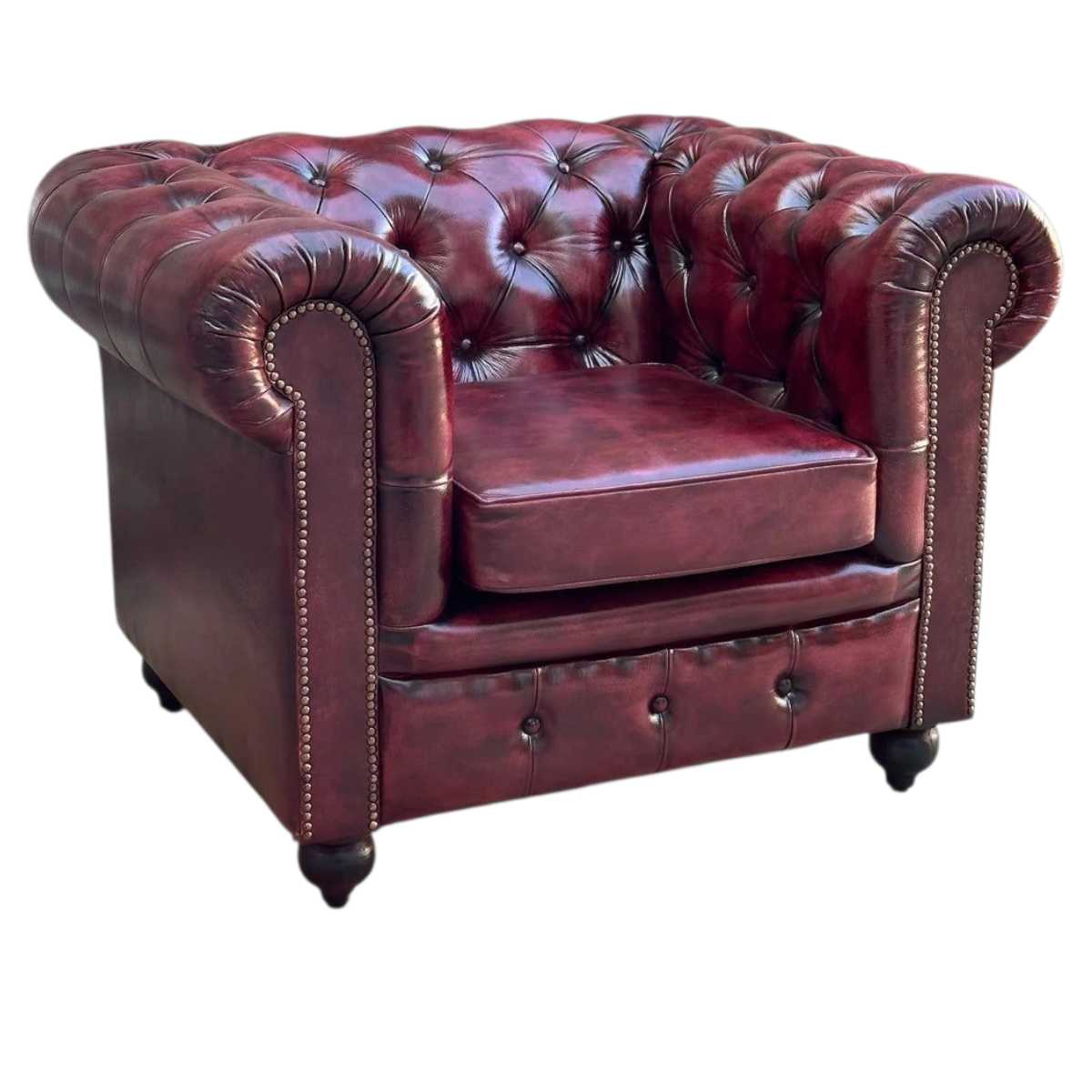 This hand crafted Worcester Chesterfield Armchair is a timeless piece of furniture made with solid wood, brass, foam, and genuine leather. Its classic design features a cushioned seat, tufted back, and arms for ultimate comfort. Built with quality and durability in mind, this antique-like armchair is sure to last for years to come.